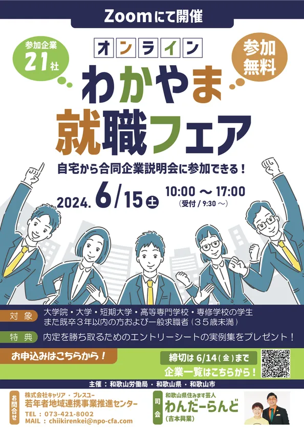 和歌山労働局は、2024年6月15日(土)にオンライン合同企業説明会「オンラインわかやま就職フェア」を開催いたします。