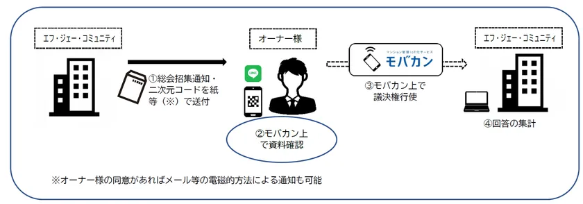 ◆「モバカン」とは、マンション管理のDX推進に特化したサービスであり、この度「モバカン」で導入する「掲示板・書庫サービス」は、管理組合の総会案内・議決権行使書類等をLINE(※)ミニアプリに配信するものであります。配信された情報は各住戸に発行する二次元コードをスマートフォンから読み込み、LINEを通じて確認することができます。