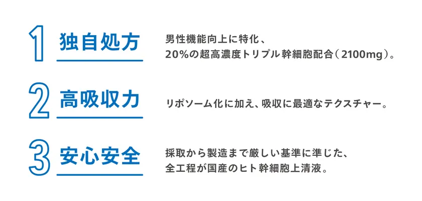 本クリームは、世界初*4のヒト幹細胞培養上清液エクソソームを超高濃度(20%)で配合しています。3種類のヒト幹細胞培養上清液(歯髄由来、臍帯(ウォートンジェリー)由来、脂肪由来)を独自の比率でブレンドし、男性の健康維持に特化した処方を実現。リポソーム化技術により吸収力を高めた上清液エクソソームを1本に2,100mg配合し、長時間の浸透が可能なテクスチャーを実現しました。原料の採取から製造まで全て国内で行っており、安心・安全にお使いいただけます。