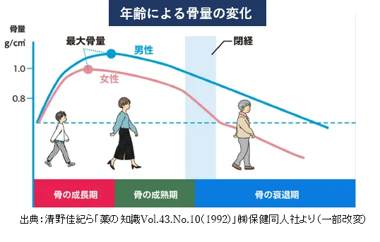 「骨の健康」と聞くと遠い未来のことと考えがちですが、骨密度は30歳代から低下し始めます。20歳代までは骨量のピークが決まる「骨の成長期」であるのに対して、30歳代からは「骨の成熟期」を迎え、過度なダイエットやストレスなどで骨量が低下するリスクがあります。さらに、40歳代以降は「骨の衰退期」に入り、加齢や女性ホルモンの減少により骨密度が減少します。