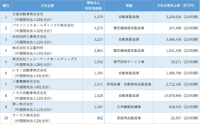 ・調査名称 :中国日系企業の特許保有数ランキング
