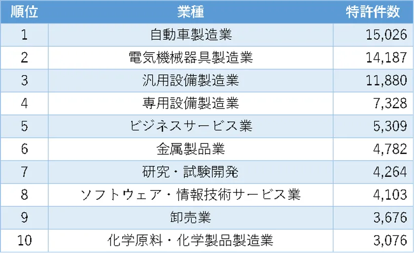 また、中国日系企業の特許保有数を業種別に集計すると、自動車製造業(特許保有数15,026件)が最も件数が多く、電気機械器具製造業(同14,187件)、汎用設備製造業(同11,880件)が後に続きます。(表2)
