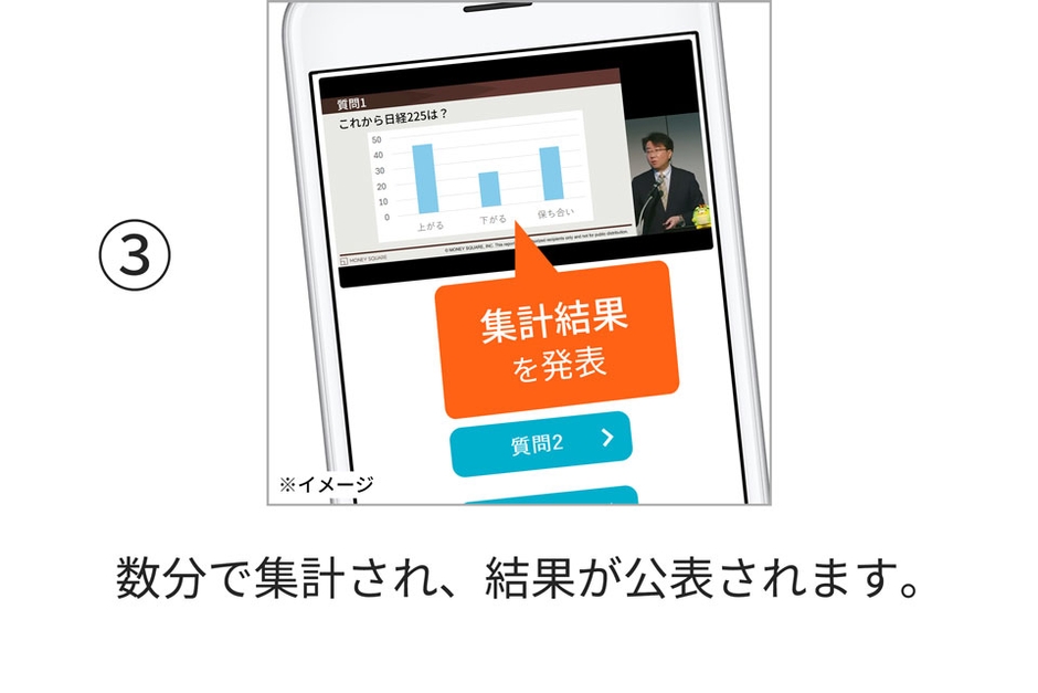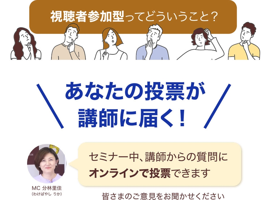 セミナー中、講師からの質問が出たら、オンライン投票ができます。数分で集計し結果を公表いたします。投票を通じて、視聴者の皆さまと講師が意見交換できます。ぜひオンライン投票にご参加ください。