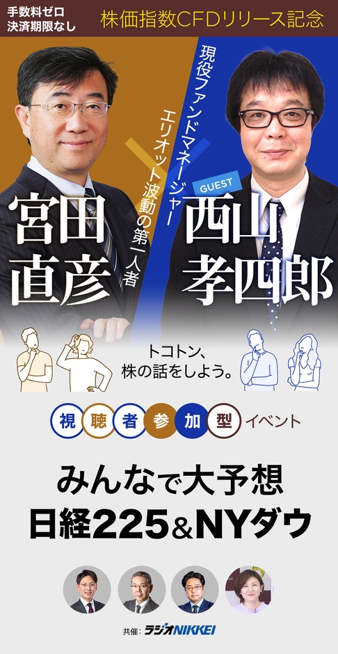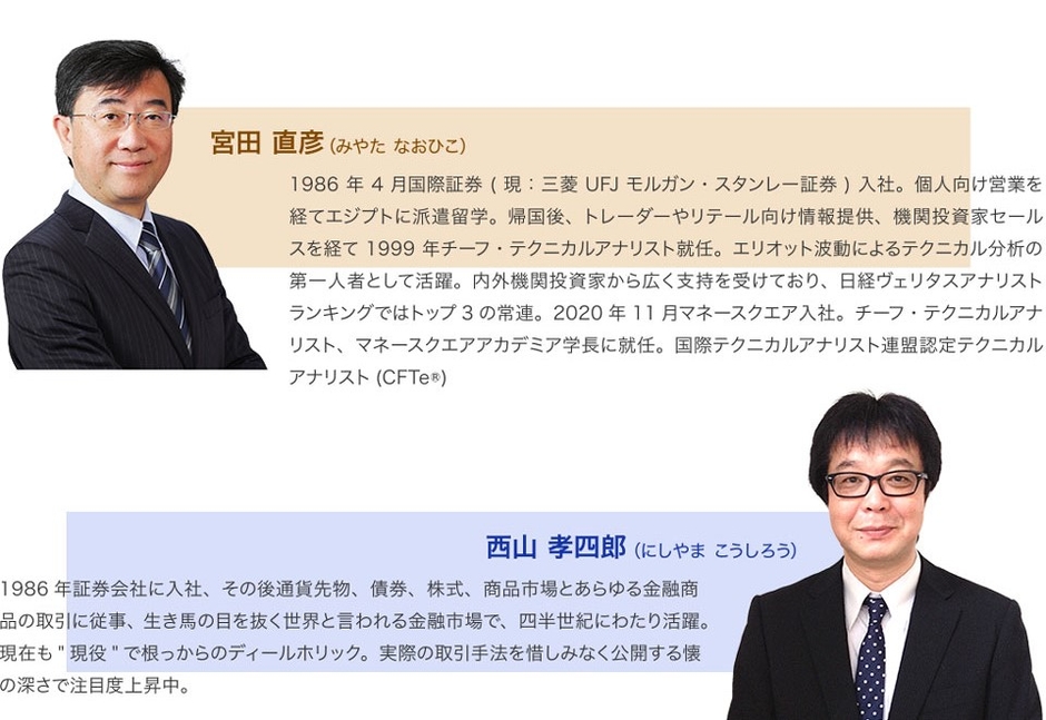 エリオット波動の第一人者・宮田直彦と、現役ファンドマネージャーの西山孝四郎が、それぞれ独自の視点で株式市場を分析。今後の展望や注目ポイントなどを披露します。