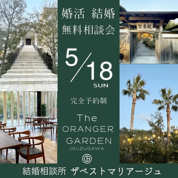 三重県の伊勢市・松阪市・津市の3店舗を拠点に、結婚相談所を運営するザベストマリアージュ(所在地:三重県伊勢市)は、独身男性・女性を対象とした結婚・婚活 無料相談会を5月18日(日)に三重県伊勢市の結婚式場ザ・オランジェガーデン五十鈴川にて行います。