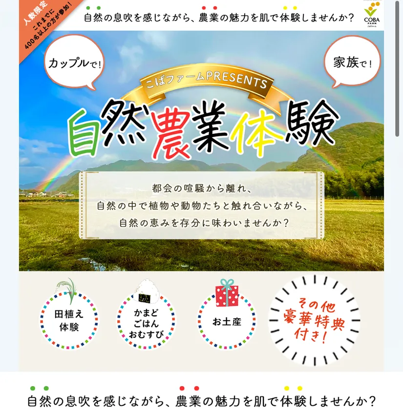 様々なものが効率化やデジタル化・グローバル化など目まぐるしく変化し、それに適応することが求められる現代において、今回、私どもの提供させていただく『自然農業体験』を通して、大自然の温かさや優しさ、多くの命で輝いている田んぼや畑に触れ「本当の豊かさは何なのか!」ということを五感で感じてもらいたいです。そして、田植えの後はとても美味しい“かまどのおむすび”を皆様で握って頬張っていただき、元気で笑顔になっていただきたいと切に願っております。そして、「よしっ!明日からまた頑張ろう!」という気持ちになってこばファームの田んぼから出発していただきたいと願います!