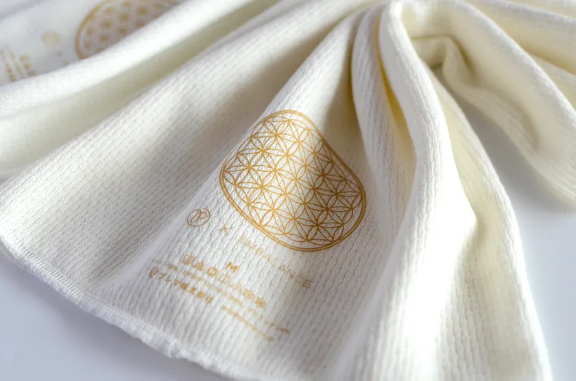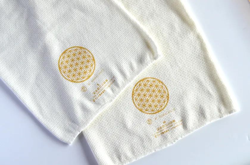 エンバランスの生地に、生命エネルギーのシンボル「フラワーオブライフ」のマークをゴールドカラーでプリントしました。マークを子宮や胃など身体の気になる部分に当ててお使いいただくのもおすすめ。また、ネックウォーマーとしてもお使いいただけます。