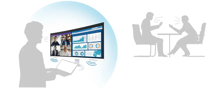 このような背景に対し当社は、Webカメラとマイクを筐体上部のベゼルに馴染むように内蔵し、デザインと機能性を両立したモニターEV3450XCを発売します。34.1型UWQHD(3440×1440)の横長大画面・高解像度で、Web会議に十分な広い表示領域を提供します。