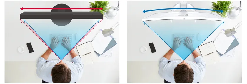 大型モニターは平面のままでは、画面の左右端に近づくほどユーザーの目と画面の距離が離れ、視認性が損なわれます。EV3450XCは、画面の両端がユーザーを中心に緩やかな弧を描いて湾曲しています。大画面ながら隅々まで見やすく、没入感があり、作業に集中しやすくなります。