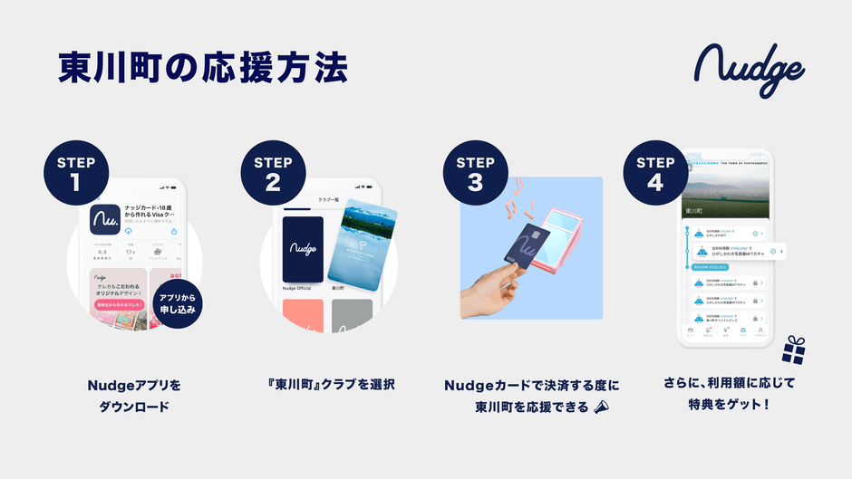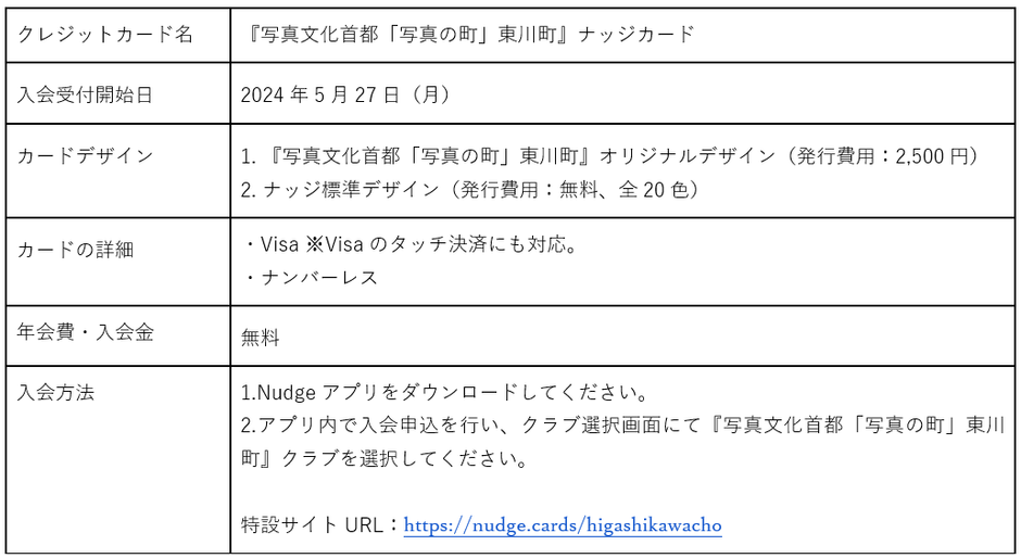 北海道東川町は、日本におけるチャレンジャーバンクを目指すナッジ株式会社(本社:東京都千代田区、代表取締役:沖田 貴史、以下「ナッジ」)と連携し、次世代クレジットカード「Nudge(ナッジ、以下「ナッジカード」)」において、本日5月27日、北海道上川郡東川町のクラブ『写真文化首都「写真の町」東川町』を開設いたしました。このクラブでは、ナッジカードを利用することで、その利用額の一部が東川町のまちづくりに活用されます。