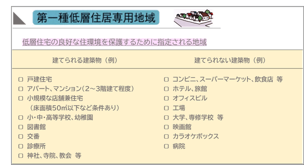 例えば、13ある用途地域の中の『第一種低層住居専用地域』を見てみましょう。