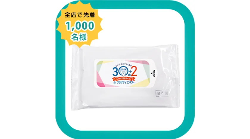 5月28日(火)に32周年を迎えたコンタクトレンズ専門店 プラザアイ コンタクトでは、5,500円(税込)以上お買い上げのお客様に、プラザアイ コンタクト32周年記念除菌ウェットティッシュを全店舗で先着1,000名様にプレゼント!