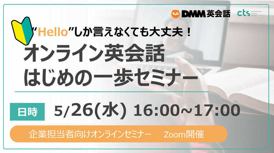 企業向け語学研修の株式会社シー・ティー・エス(本社:大阪府大阪市北区、代表取締役:岩名 葵、以下、CTS)は、2021年5月26日(水)16:00より企業の人事担当者向けに「”Hello”しか言えなくても大丈夫!オンライン英会話 はじめの一歩セミナー」を開催致します。本セミナーでは、英会話初級者がオンライン英会話に自信を持って臨めるためのコツを実際のサービス内容も交えながら解説致します。
