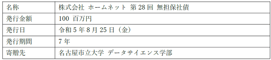 テクノロジーで気軽な住み替えをサポートする株式会社property technologies(以下「当社」)のグループ会社である株式会社ホームネット(以下「ホームネット」)は、株式会社名古屋銀行(以下「名古屋銀行」)を引受先とする、SDGs・寄贈型私募債「未来への絆」を発行し、発行手数料の一部を公立大学法人名古屋市立大学 データサイエンス学部(以下「名古屋市立大学 データサイエンス学部」)へ名古屋銀行を通じて寄付いたしました。