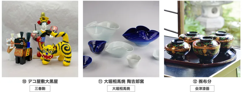 赤べこ、会津漆器、会津本郷焼、会津木綿、川俣シルク、白河だるま、三春張子、そして2011年に東日本大震災による原発事故で大きな影響を受けた大堀相馬焼 ―。