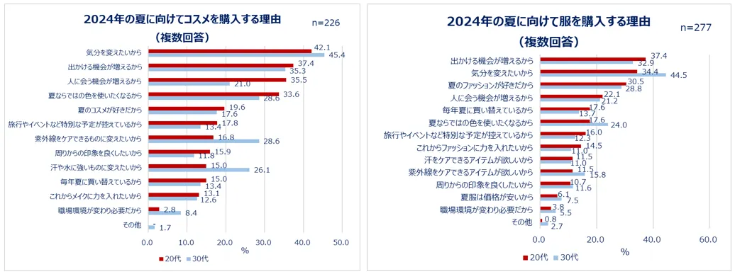 服を購入する理由は、30代はコスメと同じく「気分を変えたいから(44.5%)」が1位に。20代では「出かける機会が増えるから(37.4%)」が1位となり、夏が始まることに対するワクワク感もうかがえます。