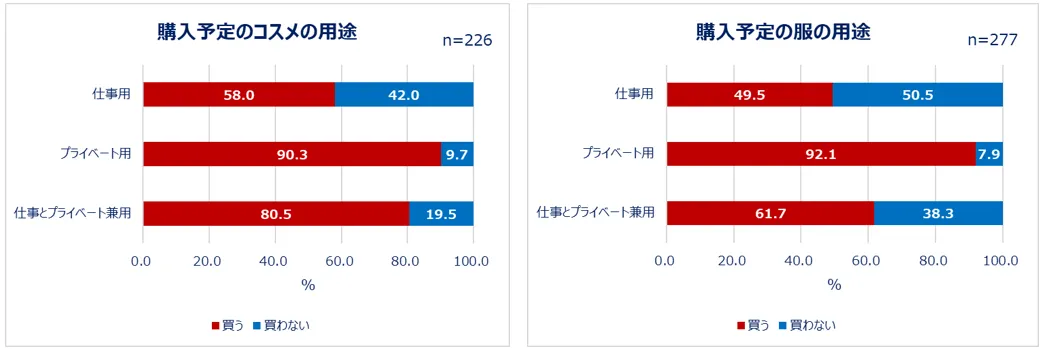 コスメや服は仕事用とプライベート用、どちらを購入予定かも聞きました。コスメ・服ともに、仕事用よりもプライベート用を買う人が多い結果となりました。服と比べてコスメは、仕事用とプライベート用を区別せず買う人が多いことも分かりました。