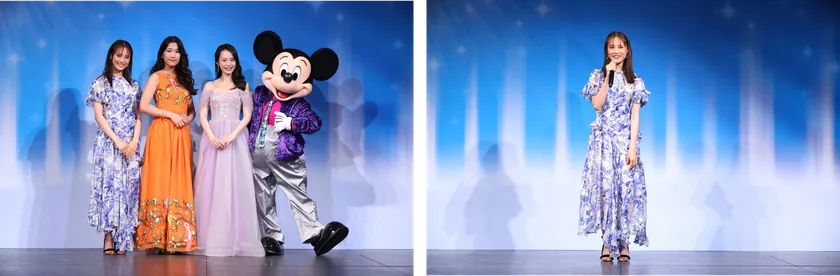 会中盤では、大友さんも楽しみにしている『ミラベルと魔法だらけの家』から、ミラベルの日本版声優を務めた斎藤瑠希さん、ミラベルの姉・イサベラの日本版声優を務めた平野綾さんがゲストとして登場。ミラベルとイサベラにインスパイアされた衣装で、斎藤さんは「『ミラベルと魔法だらけの家』にも登場する、アントニオという肩に鳥を載せたキャラクターがいるので、鳥と大きな刺繍が印象的な衣装にしました」、平野さんは「お花を使うキャラクターだったのでアイスとお花をイメージしたドレスにしました」とコメントしました。