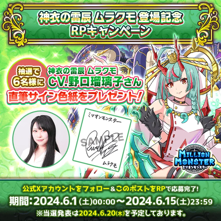 株式会社EX(所在地:東京都渋谷区、代表取締役:小野順季)は、iOS/Android端末用スマホRPG「ミリオンモンスター」の新キャラクター「神衣の雷辰ムラクモ」リリースに伴い、声優を務める「野口瑠璃子」さんの直筆サイン色紙が当たるプレゼントキャンペーンを2024年6月1日(土) 00:00より開催いたします。