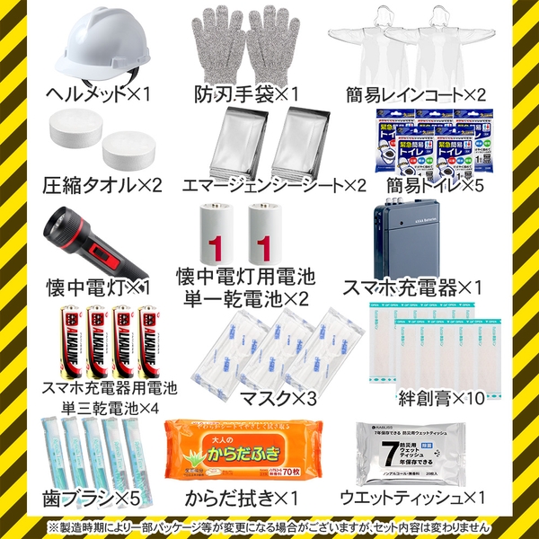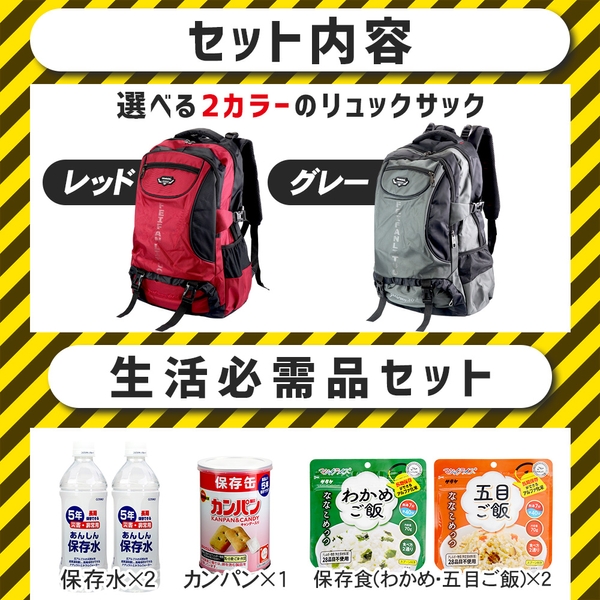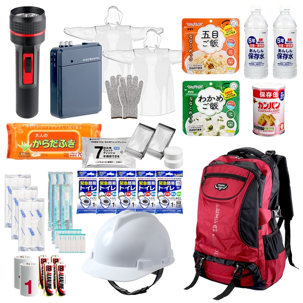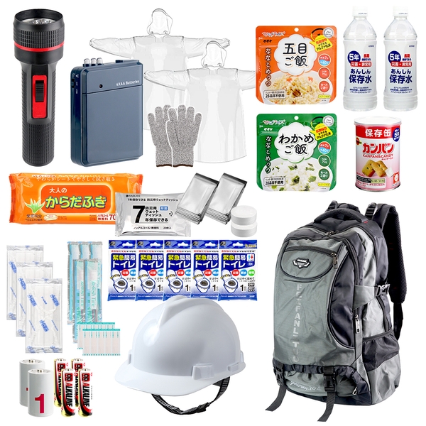 ヘルメット・保存食・ライト・バッグなどを含めた48点セットが最大のポイント!