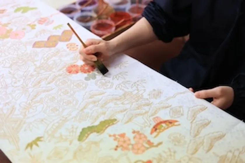 工房見学・絵付け体験A・Bは彩琳の職人が実際に使用している染料・刷毛・生地で友禅体験をしていただきます。