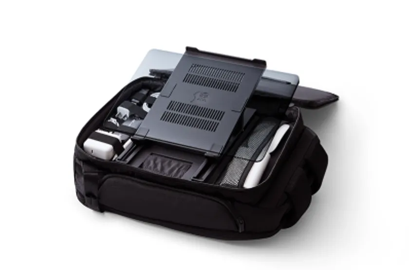 かばんの上でLTスライダーがスライドしながら角度が上がるため、デスク上と同じようにフラットな位置にノートPCを固定できる。16インチまで対応可能。国内特許登録は完了しており、加えて国際特許も出願中