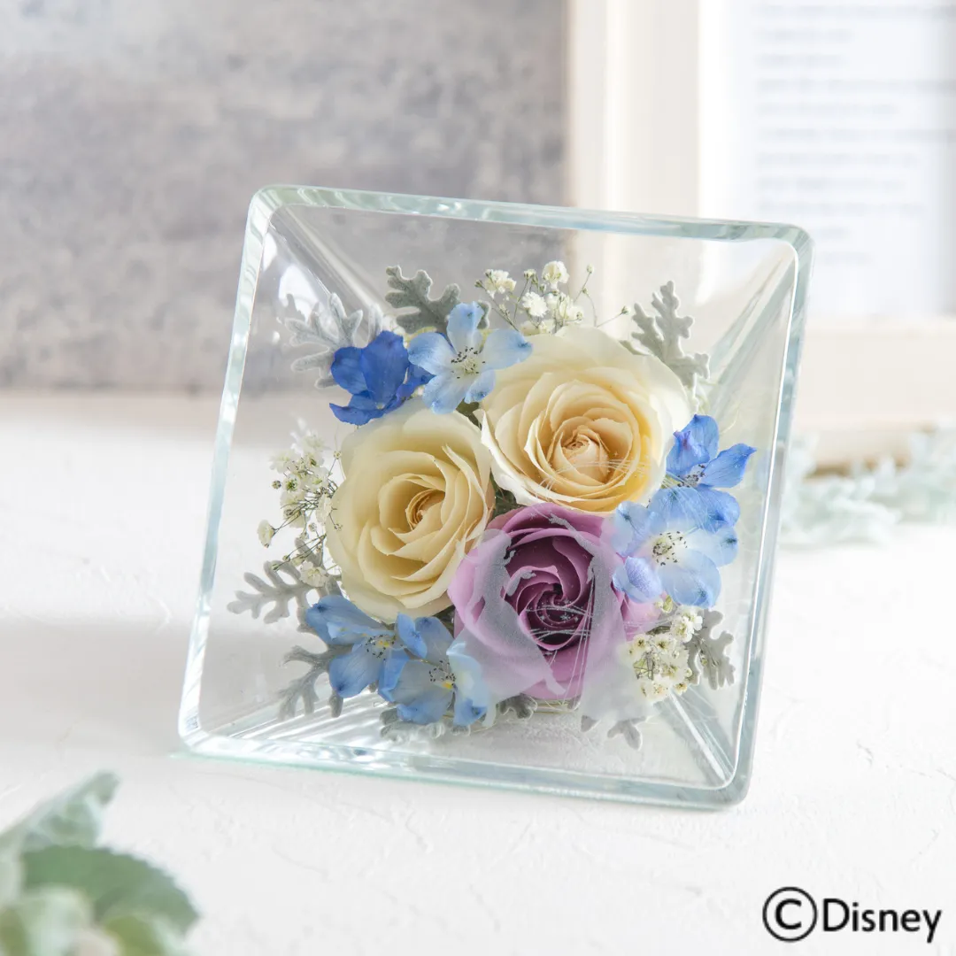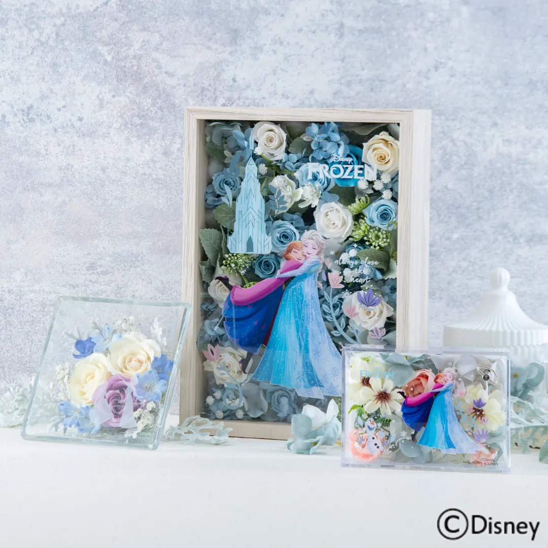 映画『アナと雪の女王』からは、3種類のフラワーアイテムが登場です。1つ目は、アナとエルサの深い絆や愛情を感じる可愛らしいアートに、ブルーやホワイトのバラ、まるで雪の結晶のような小花を添えた、氷の世界をイメージしたフラワーフレームアート。