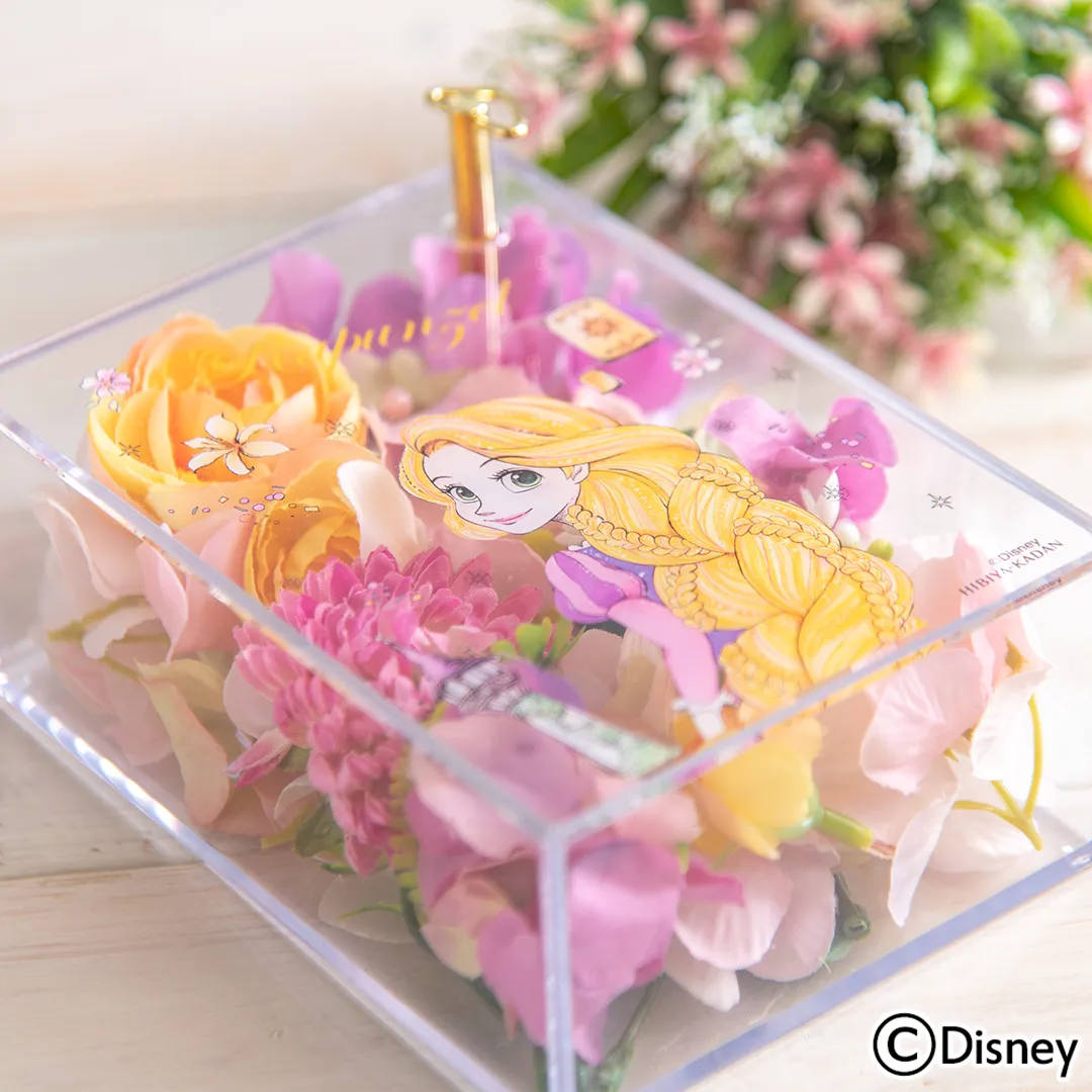 新しい世界に踏み出す勇気のすばらしさを描いた「塔の上のラプンツェル」。挿入曲の「I See The Light(輝く未来)」のオルゴールが付いたアーティフィシャルフラワーアレンジメントです。クリアなボックスに閉じ込めたお花はラプンツェルのイメージに合わせカラフルなお花でコーディネートしました。お誕生日や出産お祝いなど新しいステージを踏み出すあの人へ贈ってみませんか。