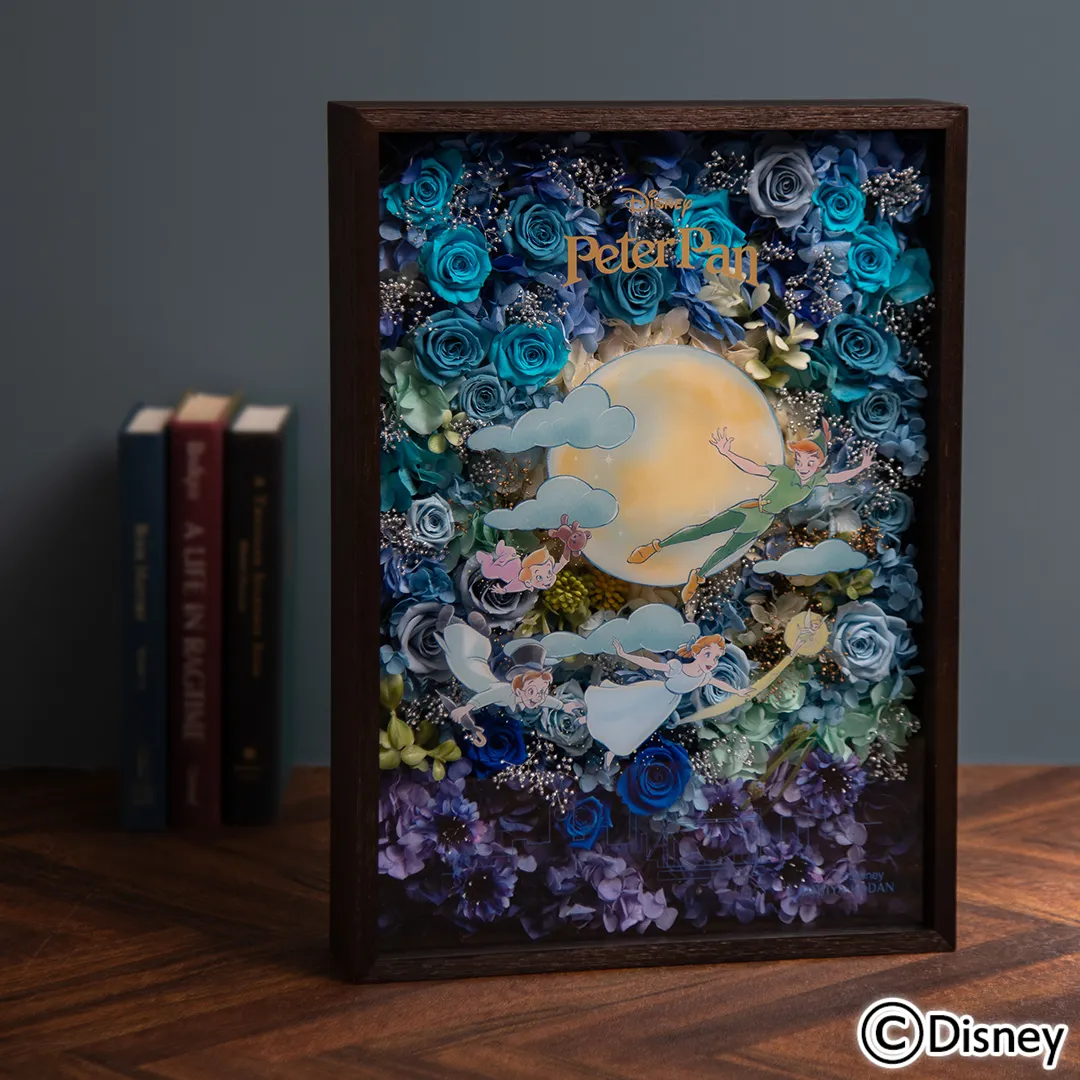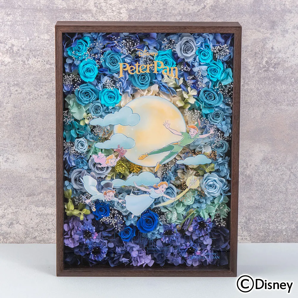 そして、映画『ピーター・パン』からは、本物のピーター・パンとともに大喜びでピーターの住むネバーランドへ飛び立つ子供たちの印象的なシーンをイメージしたフラワーフレームアートをご用意しました。月の光と夜空のグラデーションが美しいロンドンの星空を、ブルーや薄紫のバラ、繊細で美しく煌めくラメをあしらったカスミソウによって表現しました。星空を心のままに飛ぶ子供たち。わくわくするような冒険の始まりを感じられるフラワーアイテムとなっています。