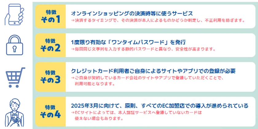 本人認証サービス(EMV 3-Dセキュア)は、ネットショッピング時にワンタイムパスワードによる本人認証をおこない、第三者による不正利用のリスクを低減させる追加認証であり、2025年3月までに原則、すべてのEC加盟店での導入が進められています。