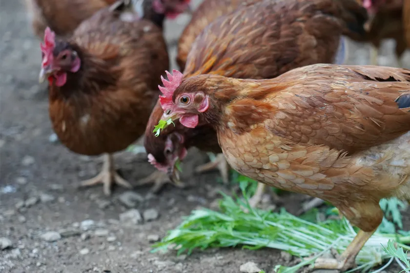 エサは日齢に応じた穀物配合飼料を使用。さらに、野草や野菜の緑餌を食べさせることが義務付けられています。