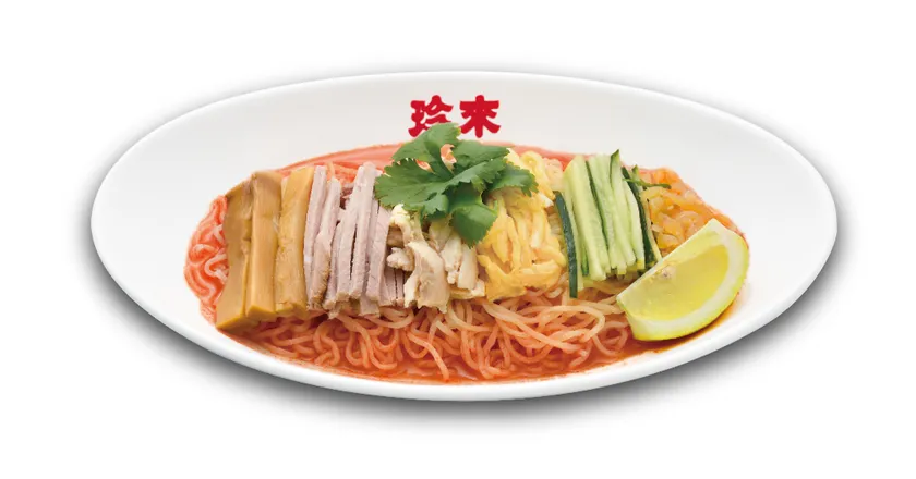 「トムヤム冷し中華」は、世界3大スープのひとつといわれる“トムヤムクン”がベースの珍來オリジナルスープを使用。プリッキー(唐辛子)の辛味とレモングラスを使った特徴的な酸味にハーブやナンプラーを珍來流にアレンジ。スパイシーで複雑な旨味のスープに珍來自慢の麺が絡み合い一度食べたらやみつきになるほど後を引く美味しさです。