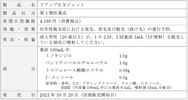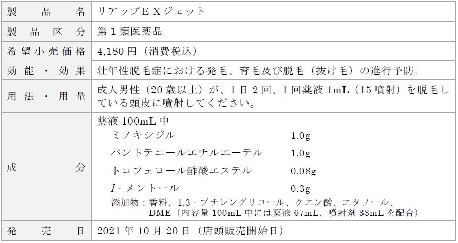 大正製薬株式会社[本社:東京都豊島区 社長:上原 茂](以下、当社)は、発毛成分のミノキシジルを1%配合した発毛トニック「リアップEXジェット」(第1類医薬品)を2021年10月20日(水)より全国の薬局・ドラッグストア等で発売いたします。