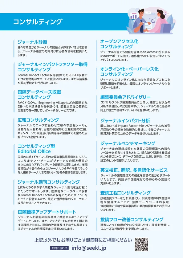 このような状況においてお客様へ適切なサービスを提供するためにわたしたちは積極的な情報収集に努め、また編集事務など様々なサービス提供を通じ、ジャーナル運営のプロフェッショナルとして数々のジャーナルの飛躍をサポートしてきました。その中で培ったノウハウをもとに日本の全てのジャーナルの質と価値の向上をミッションとするコンサルタントチーム“Seekl”を立ち上げました。