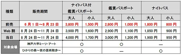 | ◆「前売パスポート」の販売について 【販売券種】 ナイトパス付鑑賞パスポート…有料会場+「ひかりの森~夜の芸術散歩~」会場への入場 鑑賞パスポート…………………有料会場への入場 ナイトパス………………………「ひかりの森~夜の芸術散歩~」会場への入場 ※当芸術祭会期限定で「シダレミュージアム」に割引入場できるセット券も販売しています。 詳しくは次の開催概要をご覧ください。 【販売期間】2024年6月1日(土)~8月23日(金) 【販売場所】e+、チケットぴあ、asoview!、ローソンチケット、ArtSticker、HHcrosstowns、LINKTIVITY |