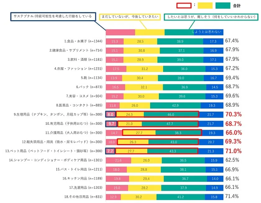 ・一方、「衛生用品」(介護用品・生理用品・育児用品・ペット用品)を購入する方は、「サステナブルな行動」の意識は1割未満にとどまる。