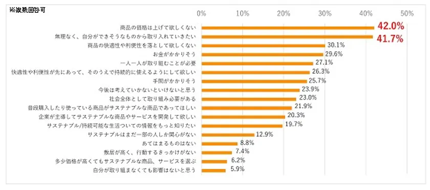 ・「サステナブルな生活」は、「商品の価格はあげてほしくない」「無理なく、自分ができそうなことから取り入れていきたい」が4割以上となる。