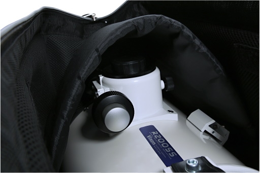 底面に樹脂製保護板を入れるとともに、棒状緩衝材2本を平行に配置することで筒状の鏡筒をやさしく保護し、収納時の安定性を確保。運搬時の振動から機材を守ります。さらにR200SS鏡筒の接眼部など大きな突起部分を保護するため、着脱可能な緩衝材を付属しています。