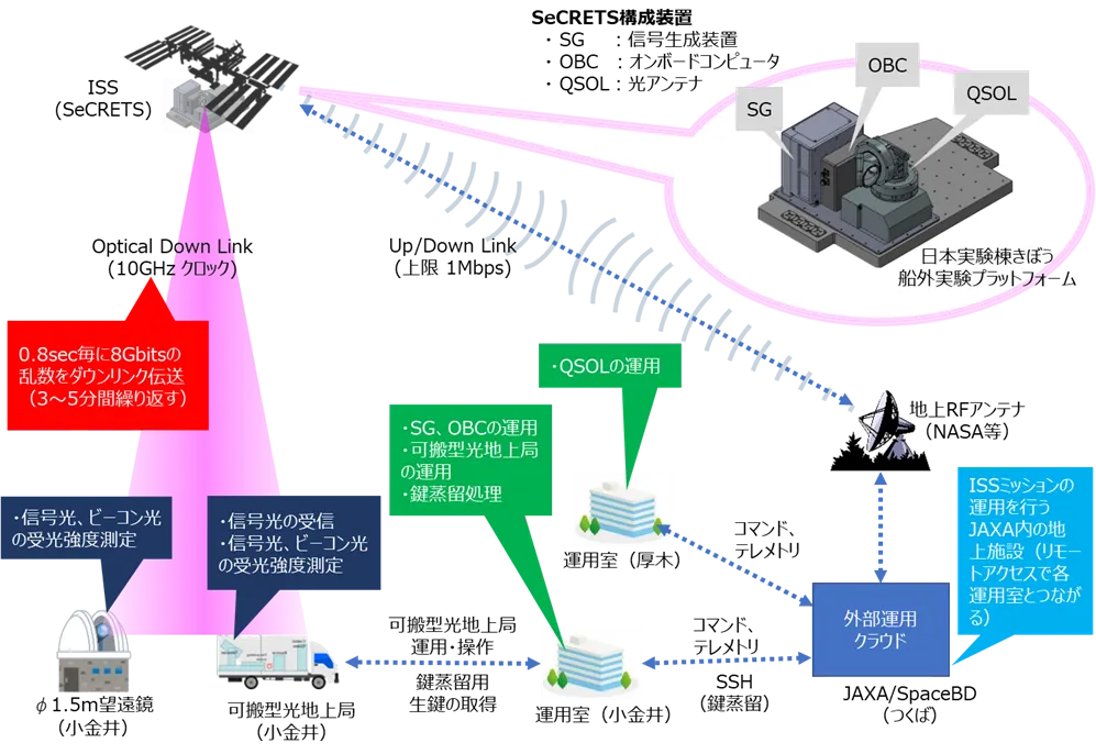 SeCRETS は2023年8月2日にISSへ向けて打ち上げられ、「きぼう」日本実験棟の船外実験プラットフォーム(中型曝露実験アダプター(i-SEEP))に設置されました。その後、低軌道上のISSから地上の可搬型光地上局への10GHzクロックの光通信により秘密鍵共有を実施し、さらにその鍵を用いたワンタイムパッド暗号によりISSと地上局とでの情報理論的に安全な通信の実証に成功しました※2。