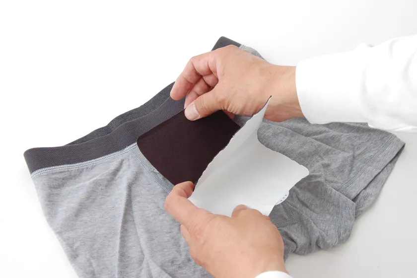通常履かれておりますパンツの内側に吸水シート裏面の紙をめくっていただきシワにならない様にゆっくり貼っていただきます。