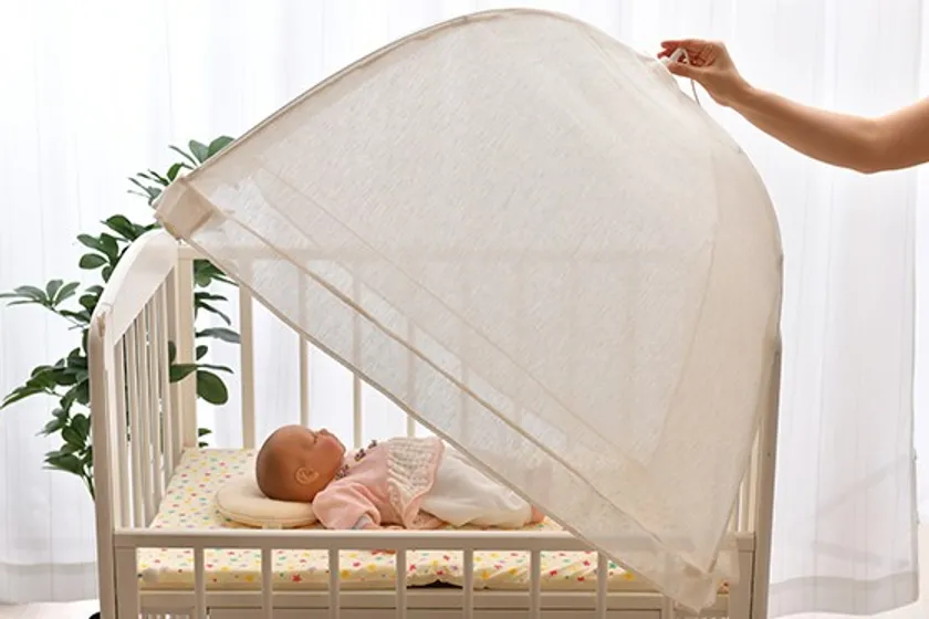 虫やエアコンの風、ホコリ、ペットの毛などから赤ちゃんを守ります。赤ちゃんやベッドや床を傷つけない樹脂キャップ付き蚊帳です。ワンタッチ式でサッと使えます。