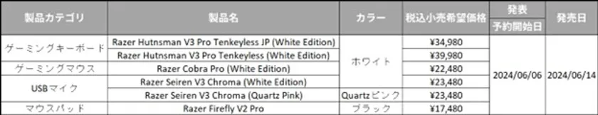 ゲーマー向けライフスタイルにおける世界のリーディングブランドのRazer(TM) (本社:米国 カリフォルニア州およびシンガポール、共同創業者兼CEO:Min-Liang Tan)は、「Razer Huntsman V3 Pro Tenkeyless JP (White Edition)」を含むホワイトエディション3製品と、全面LEDのマウスパット「Razer Firefly V2 Pro」など合計5製品を、2024年6月14日(金)より国内正規流通代理店 MSY株式会社を通じて、全国の家電量販店、PCショップ、オンラインショップ等で販売開始いたします。