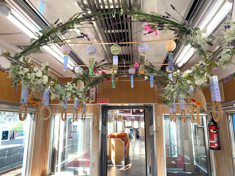 飾付を行うのは、「銀河鉄道999」で有名な漫画家 松本零士さんデザインのグリーン忍者列車と、伊賀鉄道のマスコットキャラクターをデザインした、ふくにん列車「伊賀の四季」号の車内で、2両編成のうち、伊賀上野寄りの1両です。ラベンダーカラーをイメージしたナチュラルな飾付と、素敵な香りが広がる車内で、梅雨のどんよりした気分を解消し、リフレッシュしていただけます。