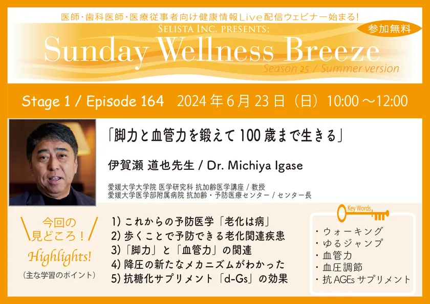 セリスタ株式会社(東京都千代田区 代表取締役 伊藤 承正)は、2024年6月23日(日)に、伊賀瀬 道也先生(愛媛大学大学院 医学研究科 抗加齢医学講座/教授)を講師にお迎えし、医師・歯科医師などの医療従事者向け無料Zoomオンラインセミナー『脚力と血管力を鍛えて100歳まで生きる』を開催します。