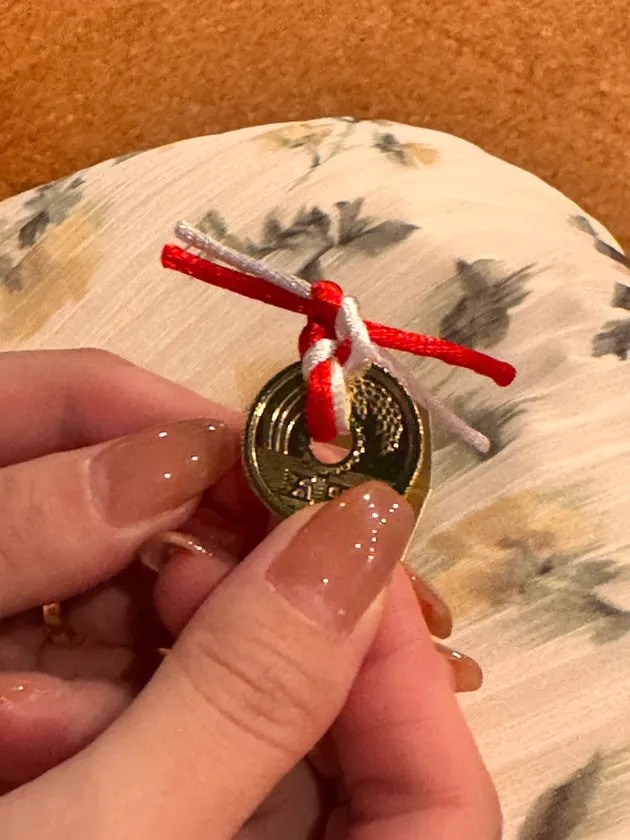 <ポイント(1) 龍神の髭を五円(ご縁)に繋いでお守り完成>