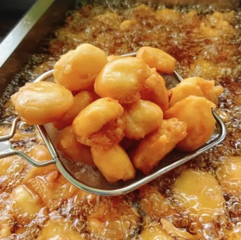親族しか知らない秘伝の配合のいも天粉をまぶし、180度の高温の油でじっくりと揚げたさつまいもは、ほんのりと甘くてホクホクでアツアツ!