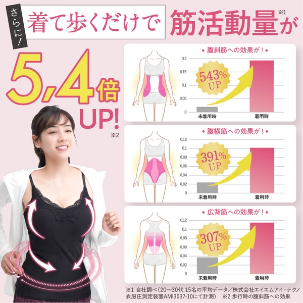「スリムアップキャミソール」も着用して運動することで、筋活動量が5.4倍もアップします。普段のインナーを本商品に変えるだけでおしゃれをしながら自然と理想ボディに近づけます。(※)
