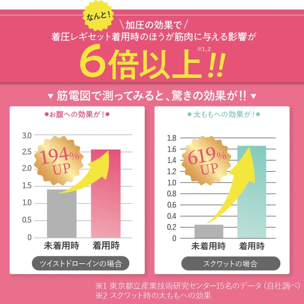 見た目の変化だけではなく、着用して運動することで筋肉運動量は驚きの6倍以上もアップするため、効率よくボディメイクができます。(※)