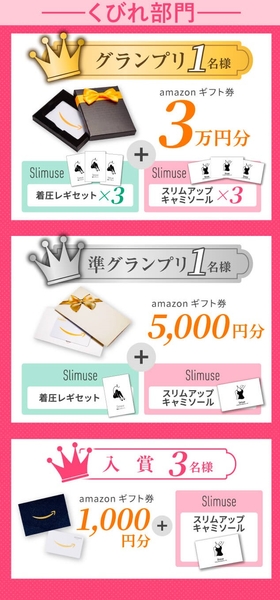 受賞した方にはamazonギフト券最大3万円分とスリミューズ着圧レギセット・スリムアップキャミソールをプレゼントいたします。