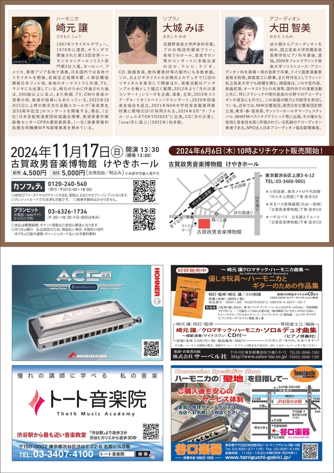 プランピット(代表:樋口義高)主催、『ファンタスティック・トリオⅡ~HARONICA・SOPRANO&ACCORDION』が2024年11月17日 (日)に古賀政男音楽博物館 けやきホール(東京都 渋谷区 上原 三丁目6-12)にて開催されます。チケットはカンフェティ(運営:ロングランプランニング株式会社、東京都新宿区、代表取締役:榑松 大剛)にて発売中です。